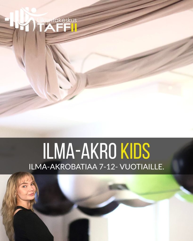 Ilma-akro kids on hauska ja turvallinen tunti, jossa lapset tutustuvat ilma-akrobatian perusteisiin joogaliinojen avulla. Tunti kehittää lasten kehonhallintaa, tasapainoa, koordinaatiota ja rohkeutta lempeässä ilmassa leijuen. Liinat tukevat ja haastavat kehoa uusiin asentoihin, samalla kun harjoitellaan ryhmätyötaitoja ja luodaan iloista liikunnan riemua.